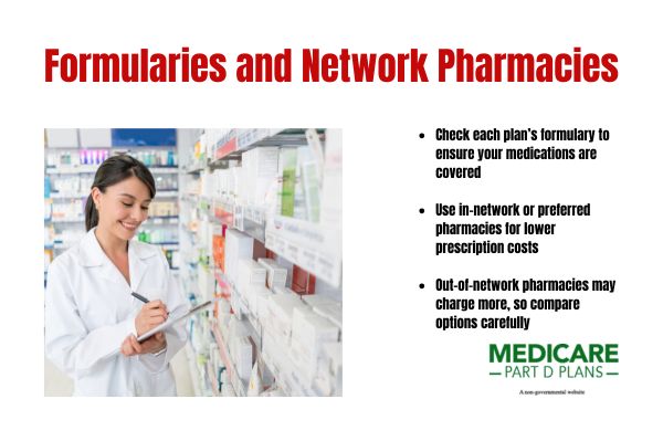 Access to medications through Part D plans will likely be contingent on using pharmacies within the plan’s designated network. Important points to consider might include: