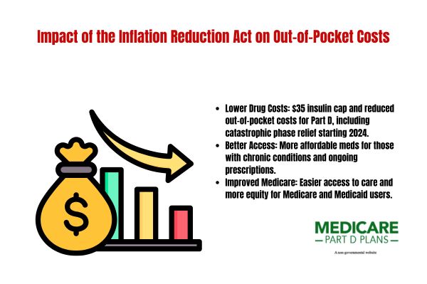 The Inflation Reduction Act could potentially reduce certain out-of-pocket costs for Medicare beneficiaries, such as offering capping copayments at around $35 for covered insulin and potentially eliminating copays for covered drugs during the catastrophic phase.